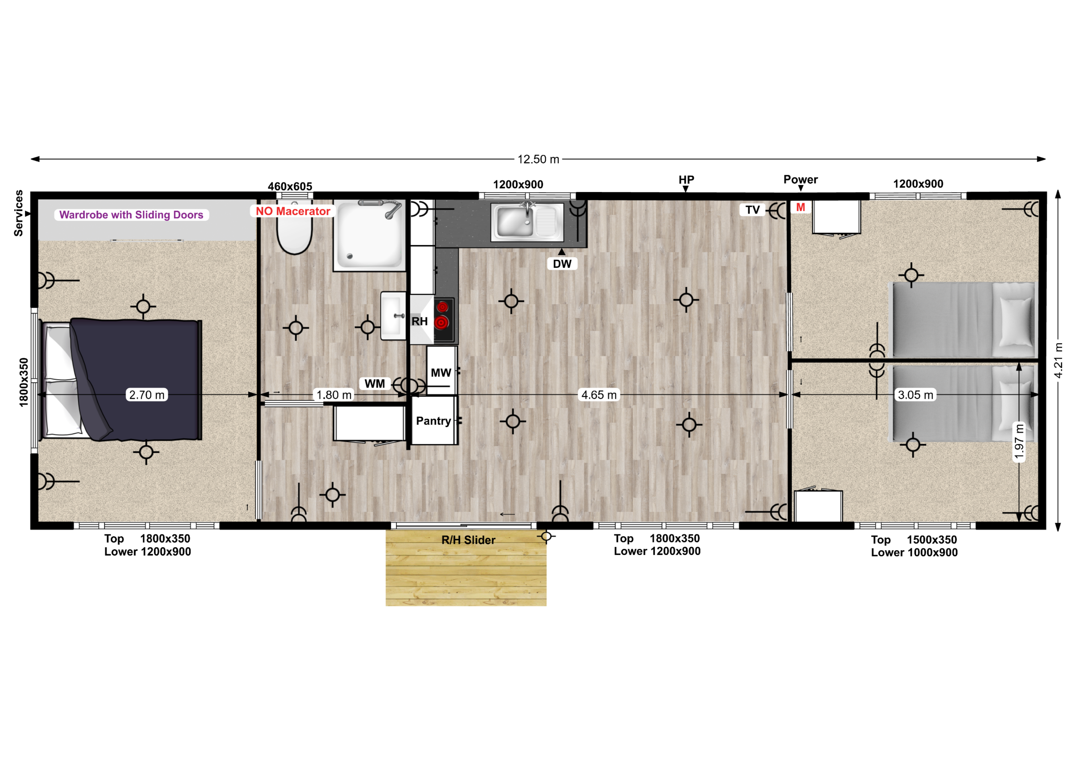 12.5 x 4.4m Three-bedroom Deluxe - Stock Clearance! For a limited time only, we’re offering wholesale factory direct pricing on our largest and most sought-after model. This is a genuine one-time stock clearance, made possible through bulk material purchases at pre-price increase rates.